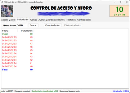 A través de una bolsa de invitaciones asignada a cada vivienda en el propio software. Esta modalidad está especialmente indicada para cumpleaños o celebraciones que requieran mayor numero de invitados que las llaves disponibles. La comunidad decide el tamaño de la bolsa para toda la temporada (pongamos 50). De esta bolsa se va descontando según las indicaciones del propietario. El control de aforo en esta modalidad es automático a la entrada, entran 10 invitados, se descuentan 10 invitaciones y se incrementa en 10 el aforo. Y manual a la salida, se descuenta manualmente según vayan saliendo los invitados.